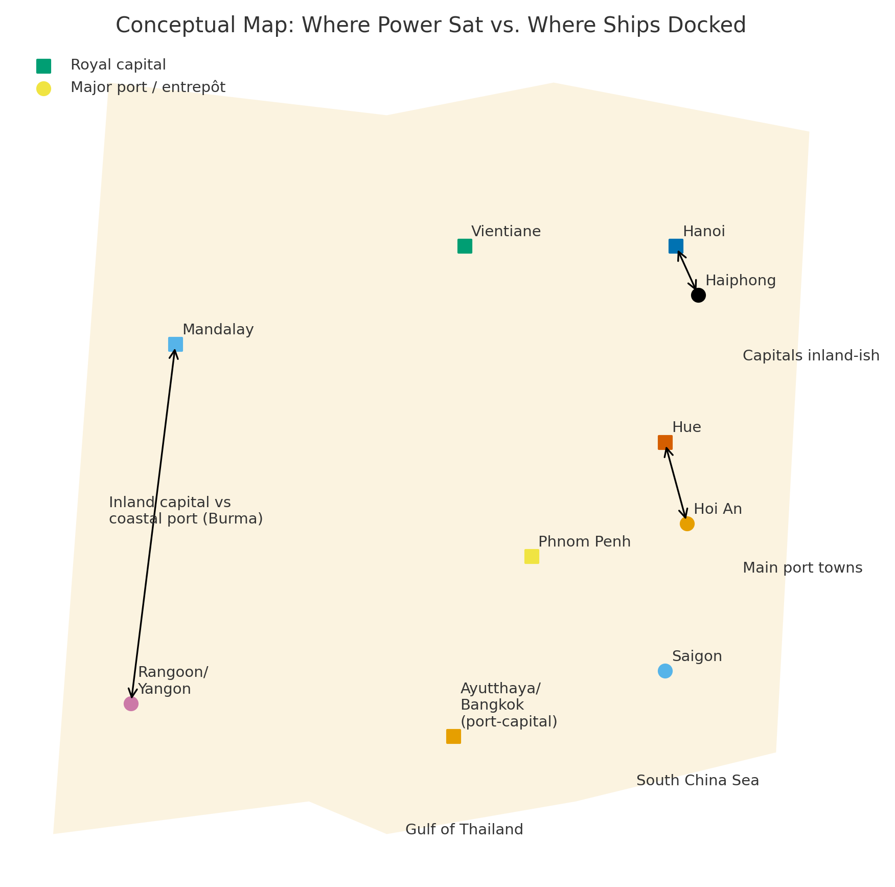 To sum up: in most of mainland Southeast Asia, the place where ships docked, and the place where power sat, were partly decoupled. Siam was the one where they largely coincided, and that mattered.